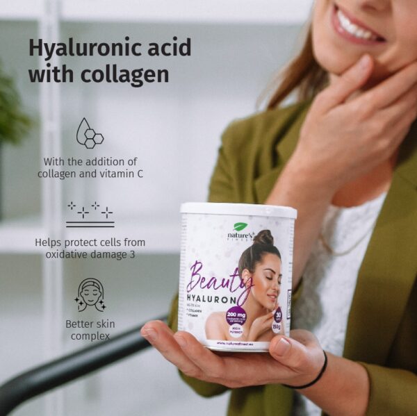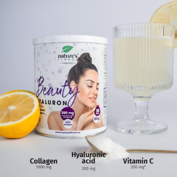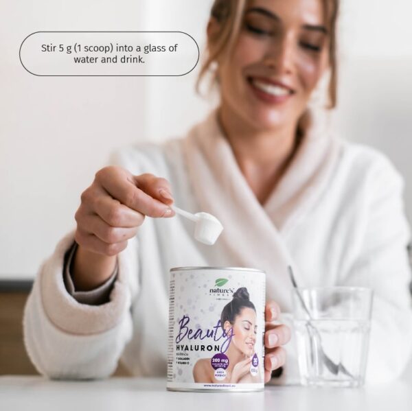 Beauty Hyaluron s 200 mg hijaluronske kiseline u dnevnoj dozi obogaćenoj kolagenom i vitaminom C. Zajedno njeguju i vlaže kožu, povećava koži elastičnost i na taj način sprječavajući bore.