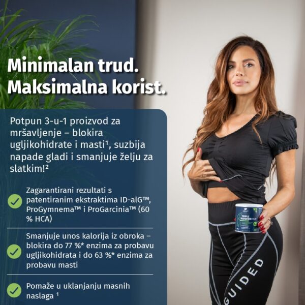 Triple Blocker PRO je poznat kao jedan od najboljih 3-u-1 dodataka za mršavljenje jer blokira ugljikohidrate i masti¹, suzbija osjećaj gladi² i smanjuje želju za slatkim³.