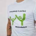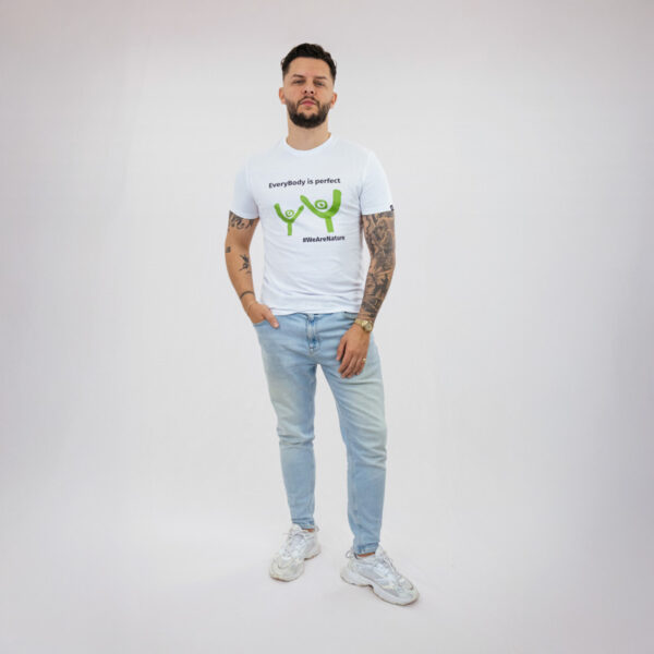 Bijela majica s upečatljivim, minimalističkim grafičkim prikazom dviju zelenih figura i porukom „EveryBody is perfect.” Dizajnirana za muškarce koji cijene samopouzdanje i autentičnost, ova majica spaja stil sa suptilnom porukom o prihvaćanju sebe.