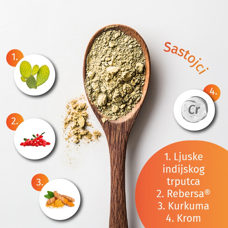 Sastojci: prah inulina, ekstrakt stabljike indijske smokve (nopal) 10:1 (Opuntia ficus-indica), aroma manga, aroma limuna, ekstrakt valerijane (Valeriana officinalis, korijen), stabilizator: celuloza, Rebersa® hidroklorid (ekstrakt Berberis aristata) u kojem 97% čini berberin klorid, ekstrakt kurkume (Curcuma longa, korijen), prah cimeta (Cinnamomum zeylanicum, kora), zaslađivač: steviol glikozidi iz stevije, krom pikolinat. Sadrži prirodne šećere.