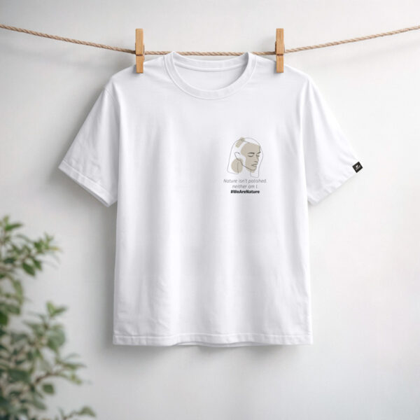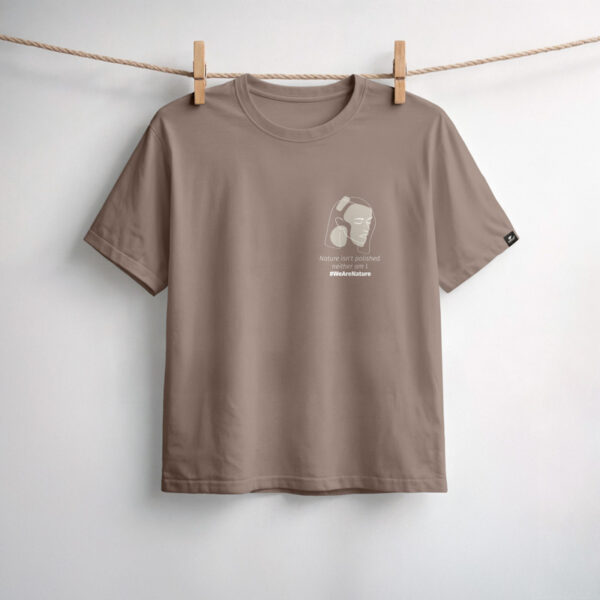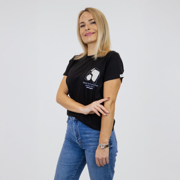 Minimalistička crna majica dizajnirana sa suptilnim dojmom. S malim, profinjenim grafičkim motivom i porukom “Nature isn’t polished, neither am I.” na prsima, slavi autentičnost i prirodnu ljepotu. Čista, nenametljiva i lako nosiva, savršena je za svakodnevno stiliziranje, a pritom nosi tihu, ali snažnu poruku.