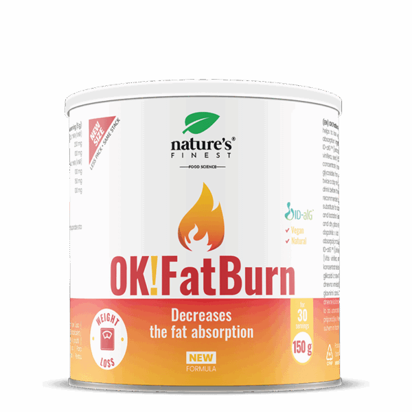 OK!Fatburn je učinkovita formula za mršavljenje koja inhibira enzime za probavu ugljikohidrata i masti pomoću ID-alG™. Trostruko djelovanje formule doprinosi normalnom metabolizmu koji proizvodi energiju⁴ uz dodatnu snagu L-tirozina i L-karnitina. Studije potvrđuju vidljivo mršavljenje povezano sa smanjenjem masne mase.¹
