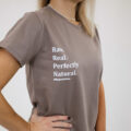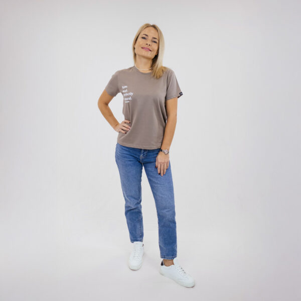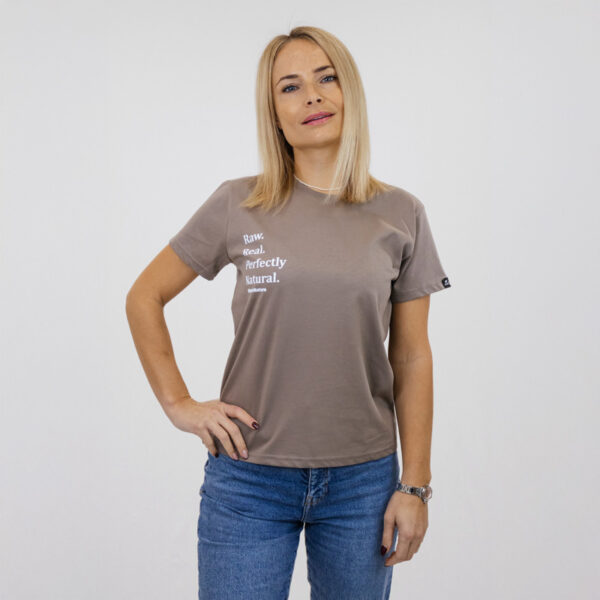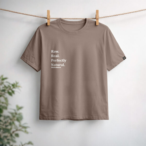 Minimalistička smeđa majica dizajnirana za ležeran svakodnevni stil. S natpisom “Raw. Real. Perfectly. Natural.” u čistom bijelom tisku, spaja udobnost s autentičnim i samouvjerenim stavom.