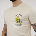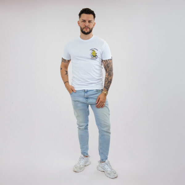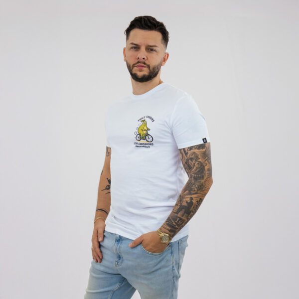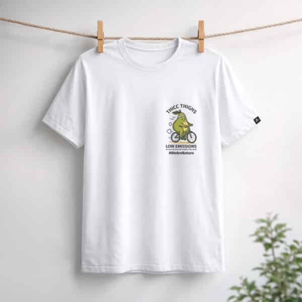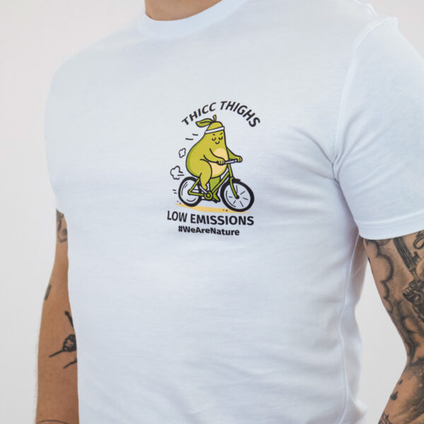 Bijela majica dizajnirana za nenametljiv svakodnevni stil. S natpisom “Thicc thighs, low emissions” i razigranom grafikom avokada na biciklu, slavi samopouzdanje, ljubav prema sebi i svjestan način života.